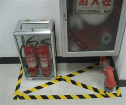 安全區域,例如滅火器放置區,控電箱區域等,在所要求的安全距離以外,用黃黑相間的膠帶將四(sì)周做標示(shì),並在區域內交叉(chā)做標示,以表明該區域任何時間(jiān)不得被占用。