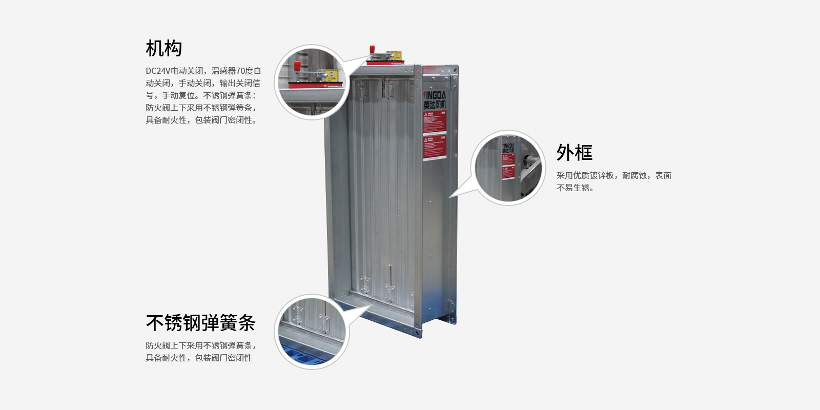 DC24V電動關閉,溫感器70度自動關閉,手動關閉,輸出關閉信(xìn)號,手動複位不鏽鋼彈簧條:防(fáng)火(huǒ)閥上下(xià)采用不(bú)鏽鋼(gāng)彈簧條,具備耐火性,包裝閥門密閉性。