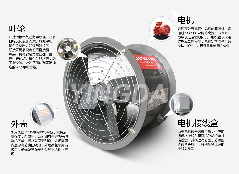 ——防爆型:電機為隔爆型、葉(yè)片為鋁合金(jīn),適用於易燃、易爆氣體的環境中,防爆等級為EXdIIBT4、EXdIICT4。
