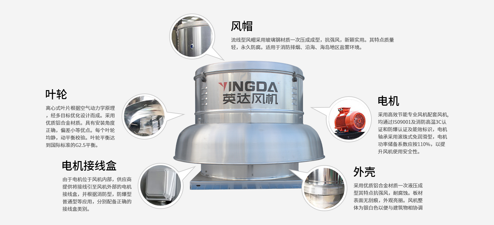 ● 鋁製葉輪; ● 電機; ● 鋁製機殼(風筒、集流(liú)器、支架);