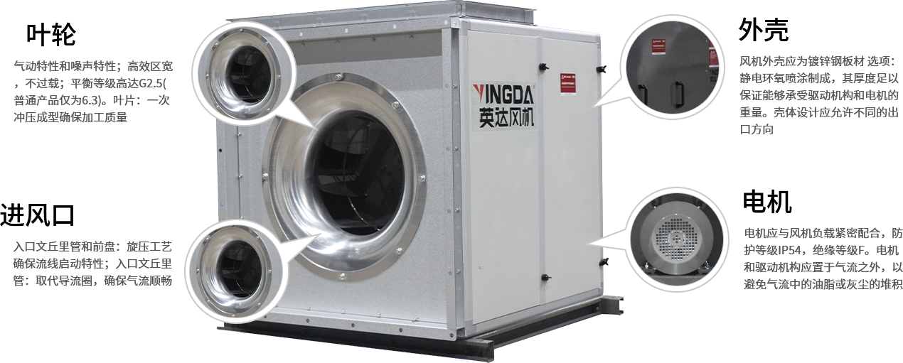 風機外殼(ké)應為鍍鋅鋼板材[選項:靜電環氧噴塗]製成,其(qí)厚度足以保(bǎo)證能夠承受驅動機構和電機的重量(liàng)。殼體設計應(yīng)允許不同的出口方向。