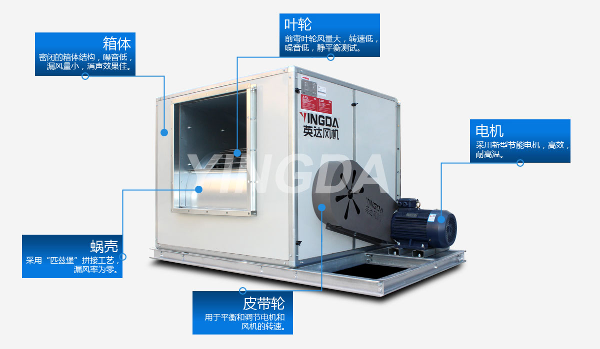 1.1.HTFC型(xíng)櫃式離心風機是一種高效率、低噪聲箱式離心風機。產品由(yóu)低噪聲前(qián)傾多翼離心風機、電機、軸承(chéng)、傳動件(jiàn)、消聲型箱體等組成。根據安(ān)裝位(wèi)置的不同,提供(gòng)12種不同的角(jiǎo)度的進出(chū)風(fēng)口位置(zhì),以滿足用戶不同(tóng)的安裝需要。根據消防與通風的不同要求(qiú)分A式和B式兩種類型,A式電機裝在箱體外,用於消防排煙,並經國家消防裝備監督質(zhì)量檢驗中心按GA211-2009《消防排煙風機耐高溫試驗方法》進(jìn)行耐高溫試驗,能在280℃高溫條(tiáo)件下連續運行(háng)30分鍾以上;B式電機裝在(zài)箱體內(nèi),用於通風換氣。