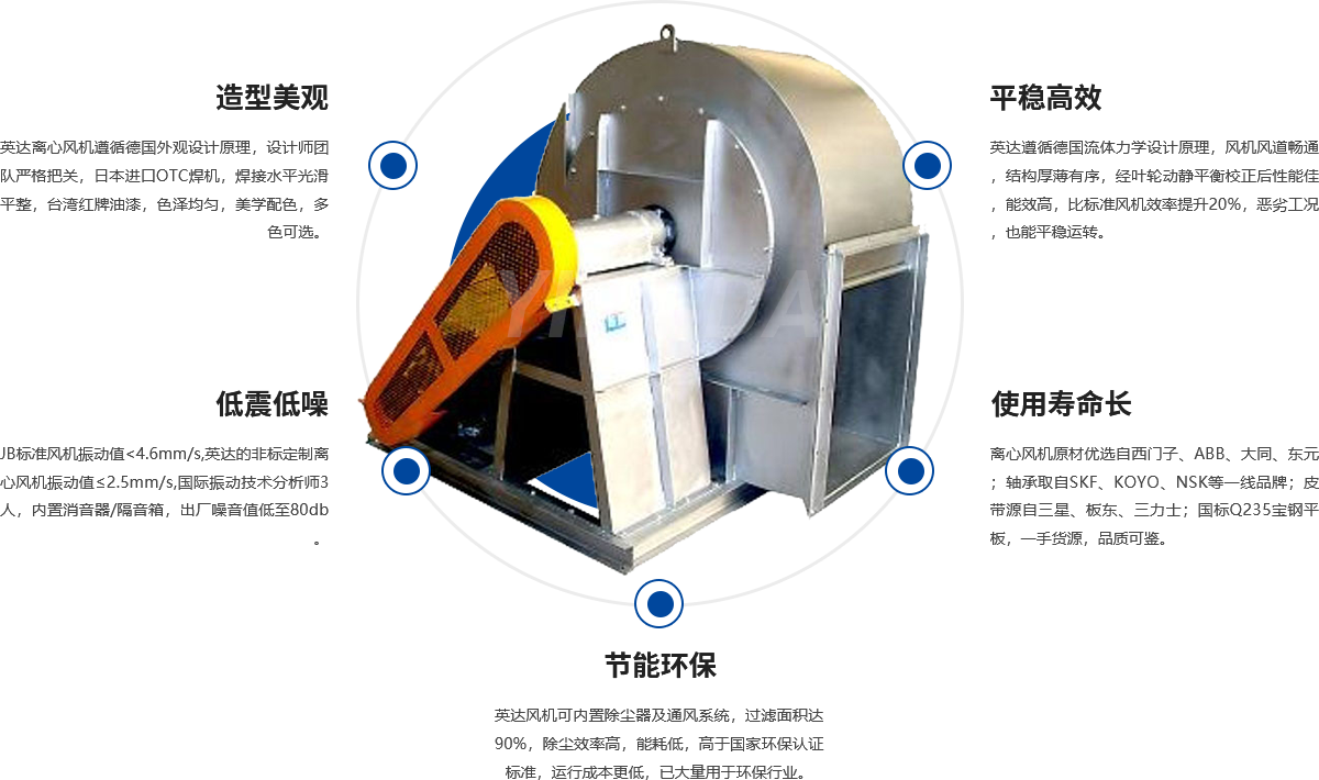 風機葉輪、機殼可(kě)選用優質Q235碳鋼,304不鏽(xiù)鋼,玻璃鋼(gāng)纖維,全部模具(jù)化生產,采用電焊、手段,表麵清潔平整、不存在焊接變形現象,葉輪經動、靜(jìng)平衡校正,其平衡精度不大於4.0級。