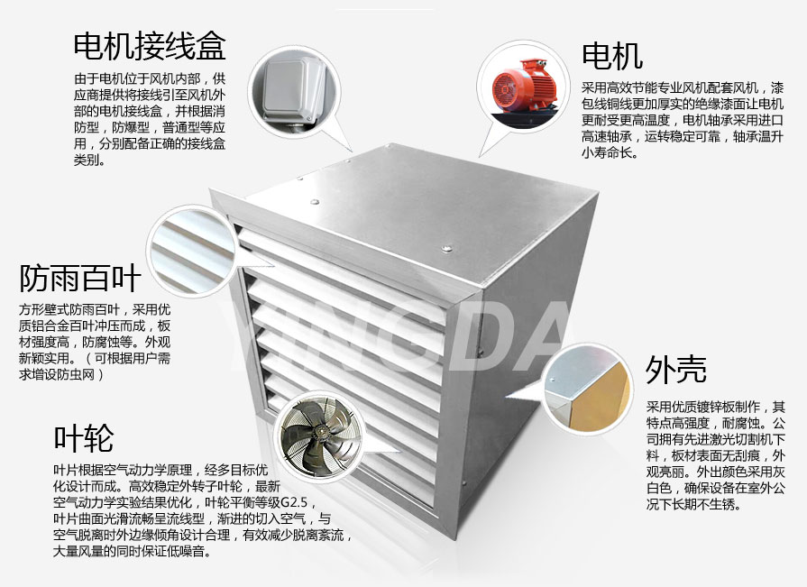 DFBZ型壁式軸流風機葉(yè)輪采用寬(kuān)葉片大弦(xián)長、空間扭曲、傾斜式葉形,可在低(dī)速時達到所需風量、風(fēng)壓降低風機噪聲(shēng),風機機殼外層方形,內層為圓形,可進一步降低風機噪聲。風機安裝於牆體內(nèi),靠牆側裝有鋁合金防雨百葉,可以防(fáng)止室外(wài)雨水和自然風向室內倒灌。
