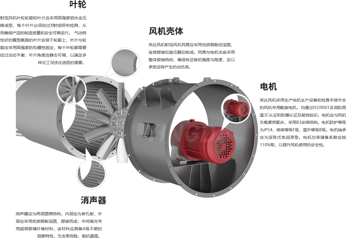 射流風(fēng)機葉輪輪轂和(hé)葉片應采用高強(qiáng)度鋁合金壓鑄成型,每個葉片必須經過X射線探傷檢測,從而確保產品(pǐn)的製造質量(liàng)和安全(quán)可(kě)靠運行。 氣動特性好的翼型截麵(miàn)的葉片安裝於輪轂上,葉(yè)片(piàn)與輪轂應采用高強度防鬆螺栓固定,每個葉輪都(dōu)需要經過動態平衡(héng);葉片角度應靜態可(kě)調,以(yǐ)滿足多樣化工況優化選型的需要。